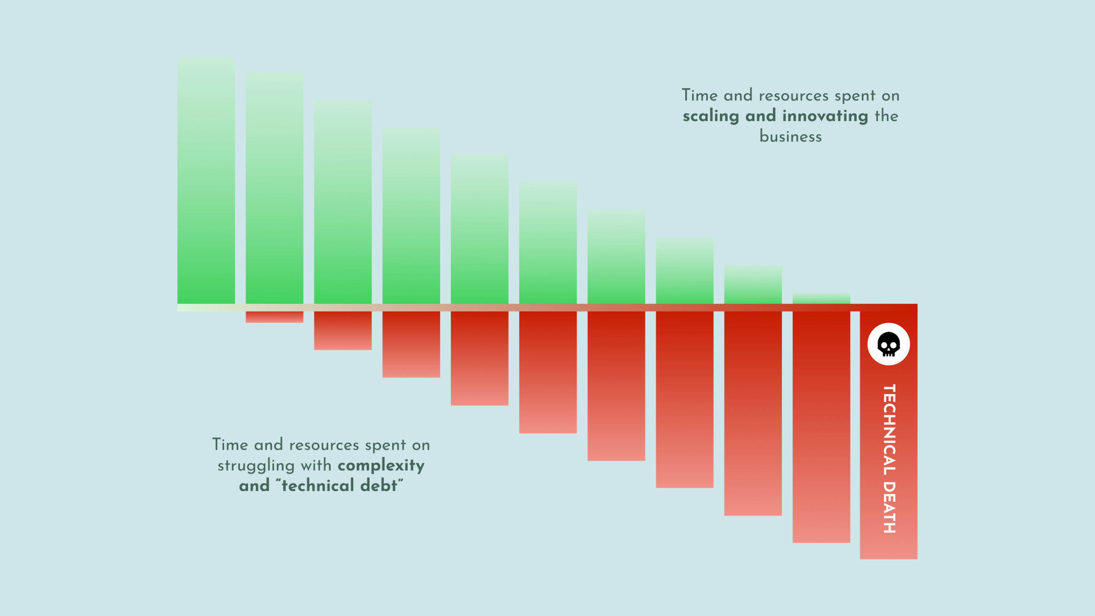 The consequence of neglecting the increased system and data complexity while scaling the business can be fatal – or put directly – may result in “technical death”. This slow demise occurs as layers of complexity accumulate over time. The complexity is often disguised as quick wins, or “frantic interventions” aimed at meeting tight deadlines or hitting short-term market targets. While these efforts may have secured the bonus of the project team that managed to deliver on time and within the budget, the long-term consequences of neglecting complexity can be severe.