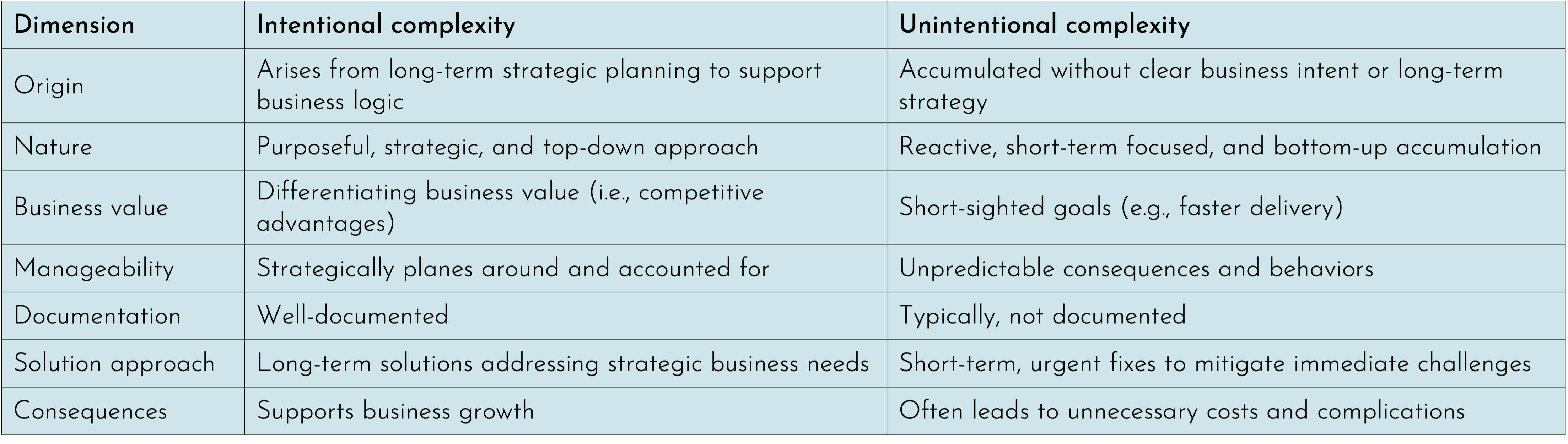 Conversely, unintentional complexity often accumulates organically over time and leads to unnecessary costs and complications without delivering direct business benefits, aside from short-term gains such as reduced time-to-market. Unintentional complexity is often expressed by obscurity, inconsistency, and unforeseeable consequences. For a detailed comparison between intentional and unintentional complexity across various dimensions, see the table below.